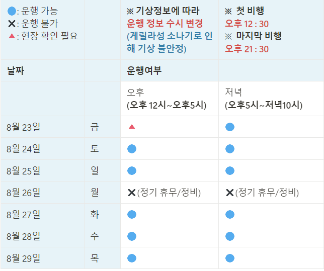특히, 기상 상황에 따라 운영 여부가 실시간으로 결정되니, 방문 전에 정보 알리미를 통해 꼭 확인해 주세요. 강풍이나 폭우 같은 날씨에는 운영이 중단될 수 있답니다.